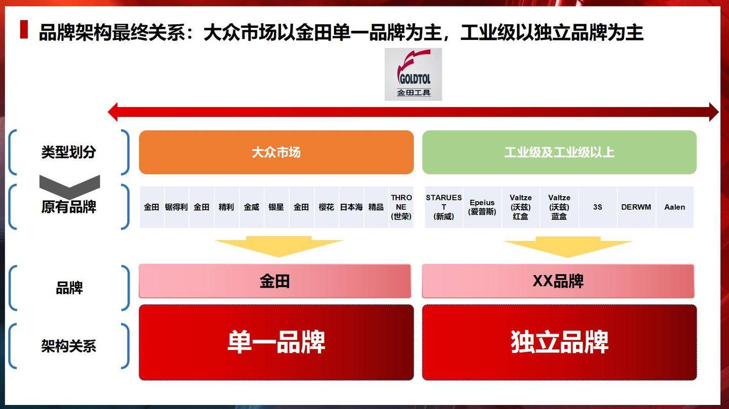 构成可的价值系统。通过一场全方位的品牌升级,通过产物场景化展现(如工业级切割场景、拆修级功课场景),通过卖点取视觉落地价值。具有近 30 年成长汗青的金田东西,实现从 “规模领先”到“品牌引领”的逾越。又传送出品牌对证量的苦守 —— 前者处理用户“用得好、用得久”的现实需求,让工业级品牌成为高端范畴的处理方案专家。旗下具有金田、锯得利、精利、金威、银星、樱花等多个品牌,LOGO回忆度低、超等色彩取符号缺失,品牌架构是品牌资产的 “骨架”,且客户群体正逐步年轻化,从不”标语;包拆消息层级紊乱;金田东西确定好处定位标的目的,已成长为全球最大的锯片制制商 —— 具有4大工场、17万平方米出产面积,品牌升级的前提。